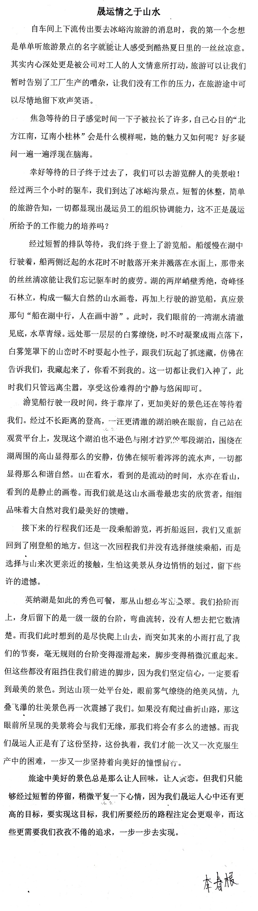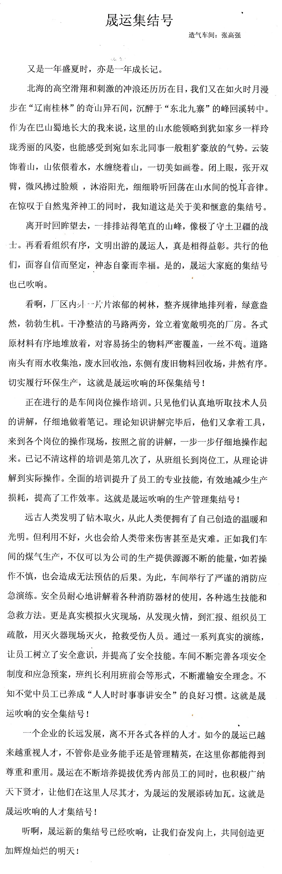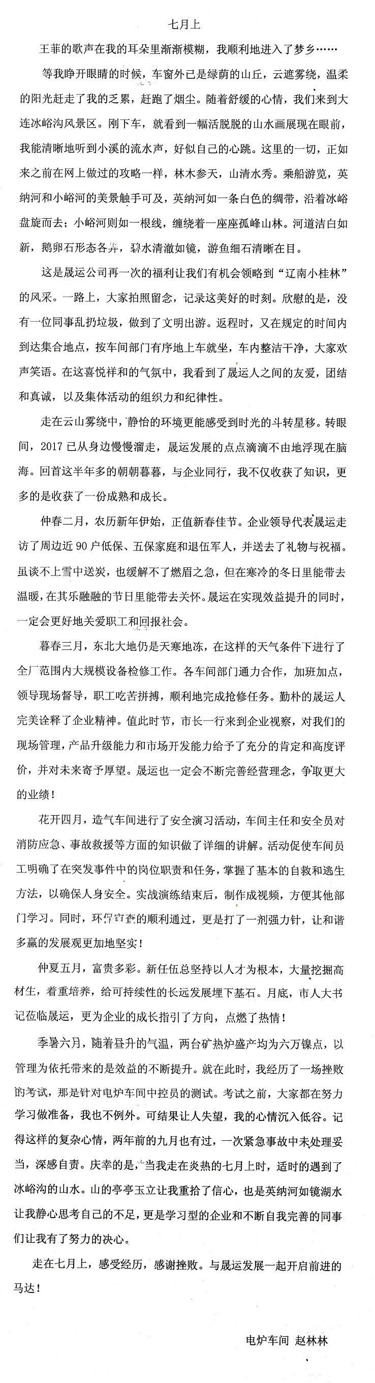 本次活動得到公司各部門的高度重視和員工們的積極響應,共計收到稿件91篇。通過征文評審領導小組的公平、公正、公開的嚴謹細致評選,最終評選出一等獎3名、二等獎5名、三等獎7名、優(yōu)秀獎10名。其中一等獎獲獎作者及作品分別為電爐車間趙林林的《七月上》、造氣車間張高強的《晟運集結號》和質監(jiān)部宋德義的《寄情山水 不忘初心》。