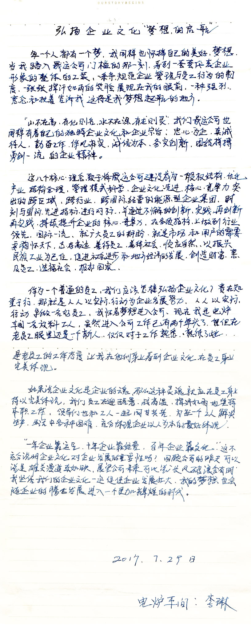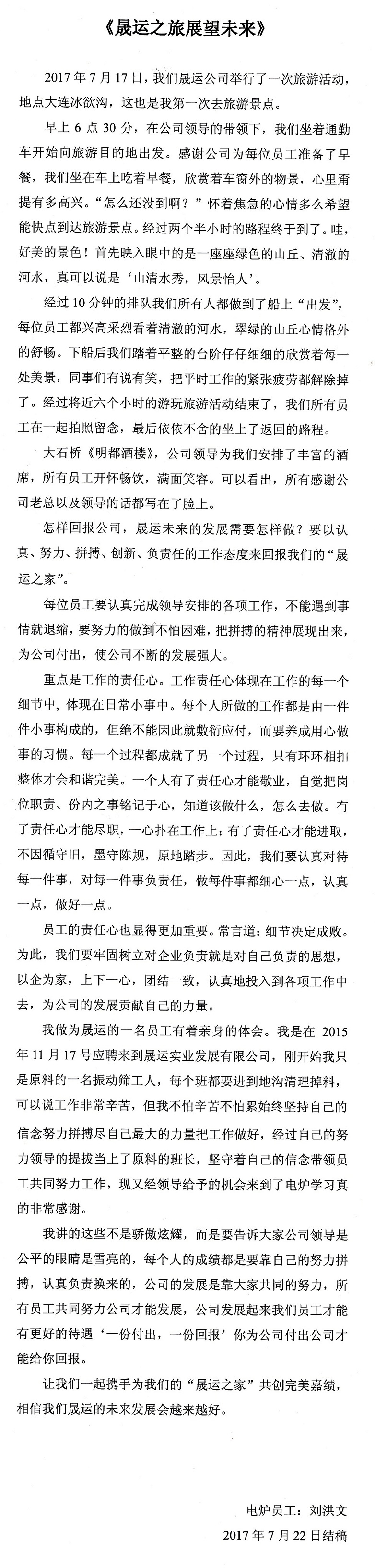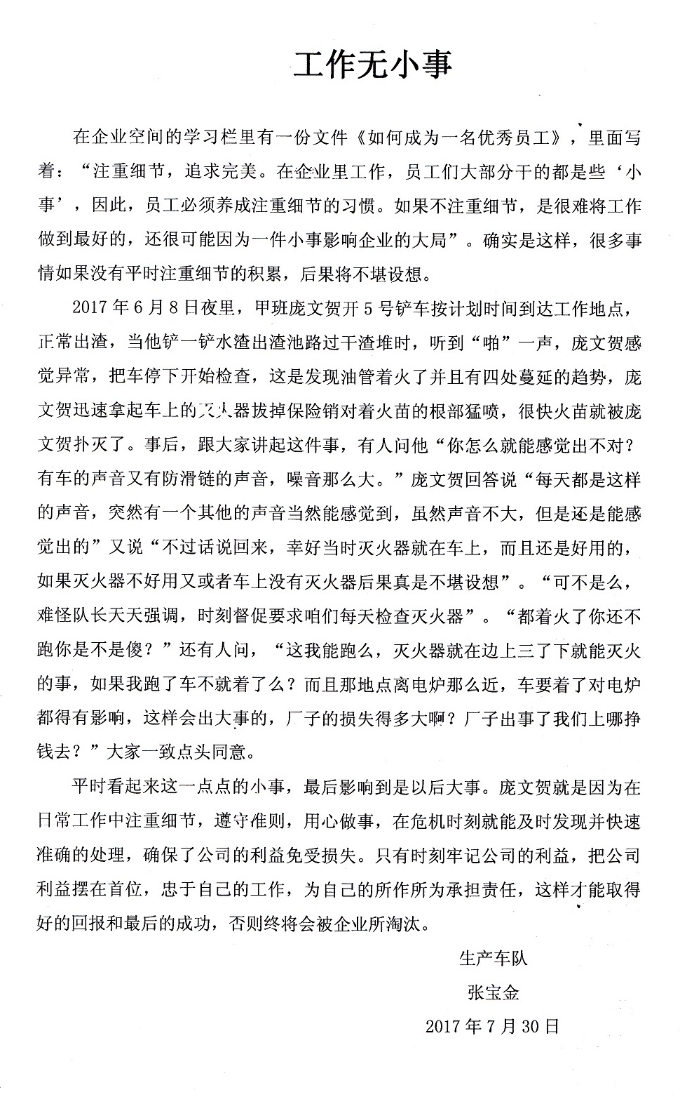 本次活動得到公司各部門的高度重視和員工們的積極響應,共計收到稿件91篇。通過征文評審領導小組的公平、公正、公開的嚴謹細致評選,最終評選出一等獎3名、二等獎5名、三等獎7名、優(yōu)秀獎10名。其中一等獎獲獎作者及作品分別為電爐車間趙林林的《七月上》、造氣車間張高強的《晟運集結號》和質監(jiān)部宋德義的《寄情山水 不忘初心》。