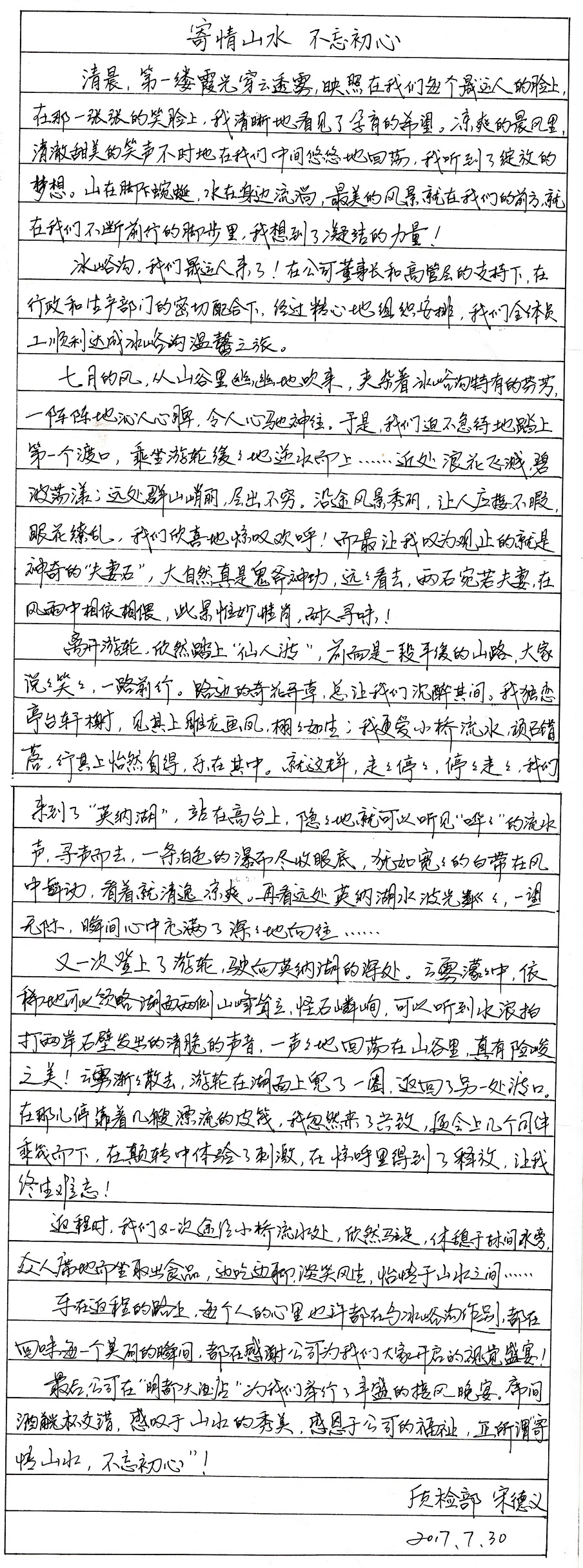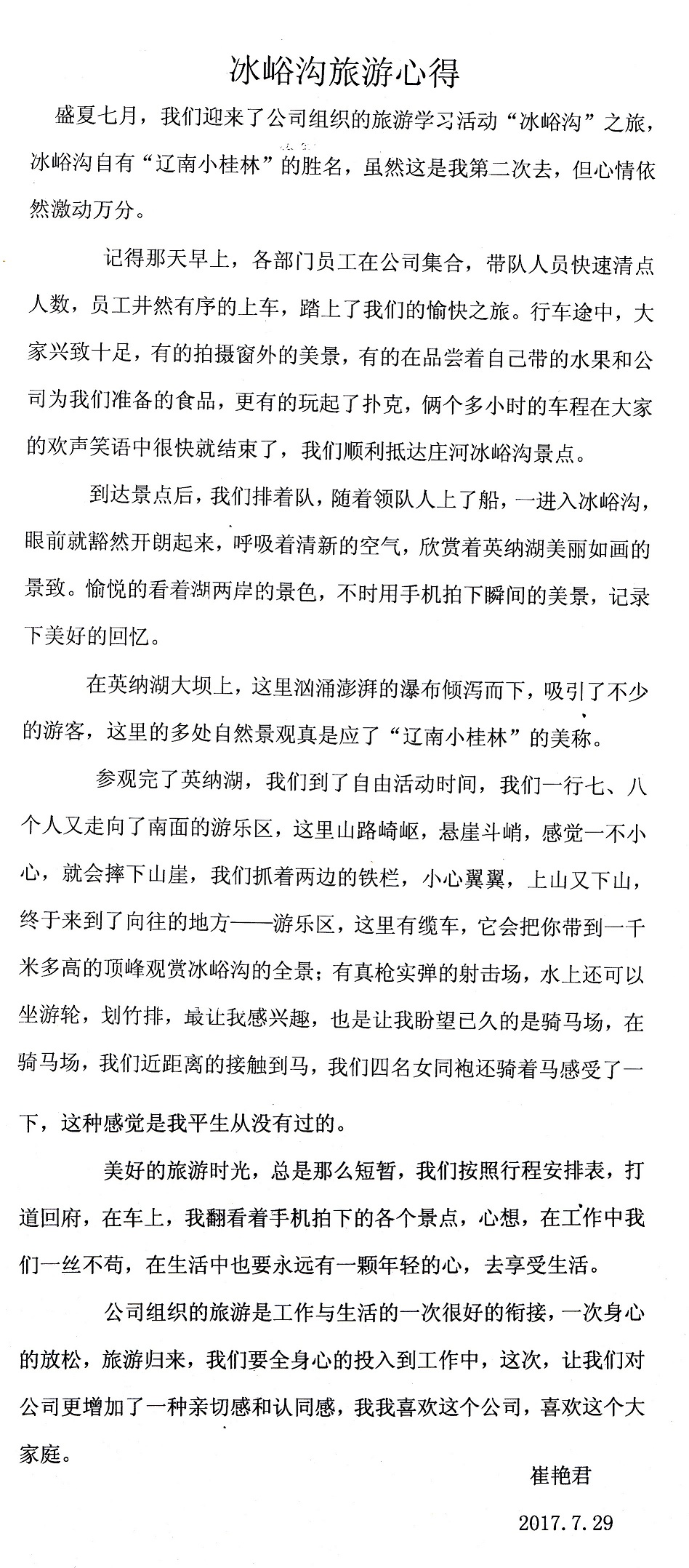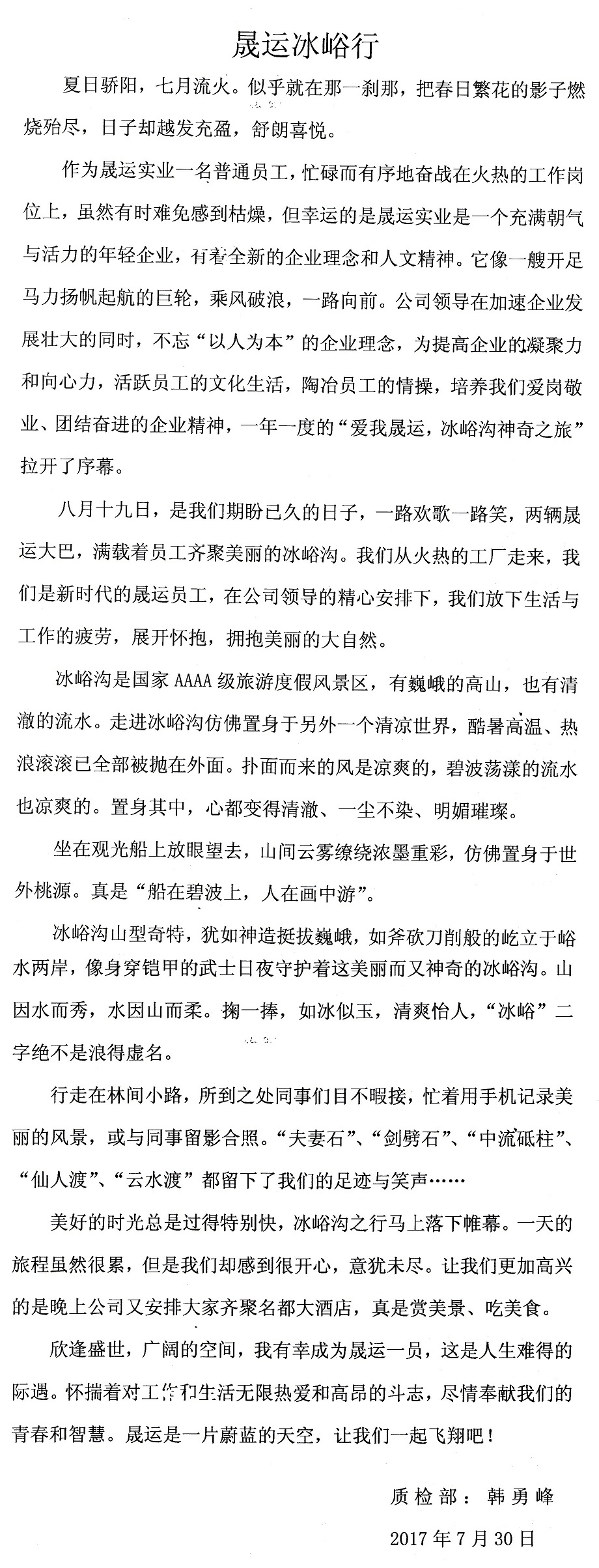 為進一步弘揚了公司企業(yè)文化精神理念,促進加深員工對企業(yè)文化的理解、認同,進而為公司的發(fā)展做出新的、更大的貢獻。2017年7月21日-8月7日,公司以夏季“冰峪溝”出游為契機,在全公司范圍內開展第二屆“企業(yè)文化故事”有獎征文活動。