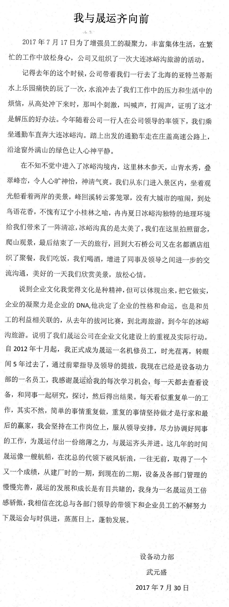 通過本次征文活動,大家圍繞企業(yè)文化說故事、談心得、講體會;通過發(fā)生在身邊的故事、親身經歷的事例,來闡述論證公司愿景、核心價值觀、企業(yè)精神。大家以良好的精神面貌和文學素養(yǎng),用樸實真摯的語言表達了對晟運大家庭的無限愛戴和希望。